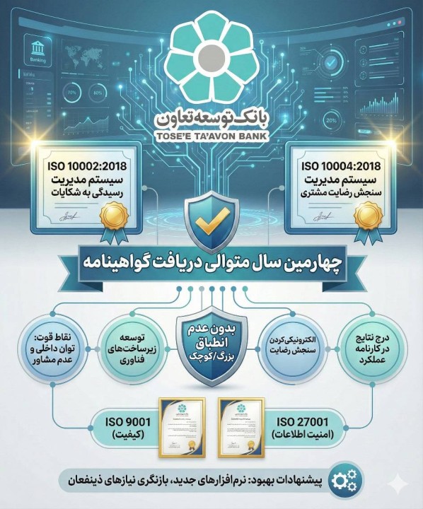 بانک توسعه تعاون موفق به دریافت دو گواهینامه استاندارد بین المللی ISO10002 و ISO10004 برای چهارمین سال متوالی شد