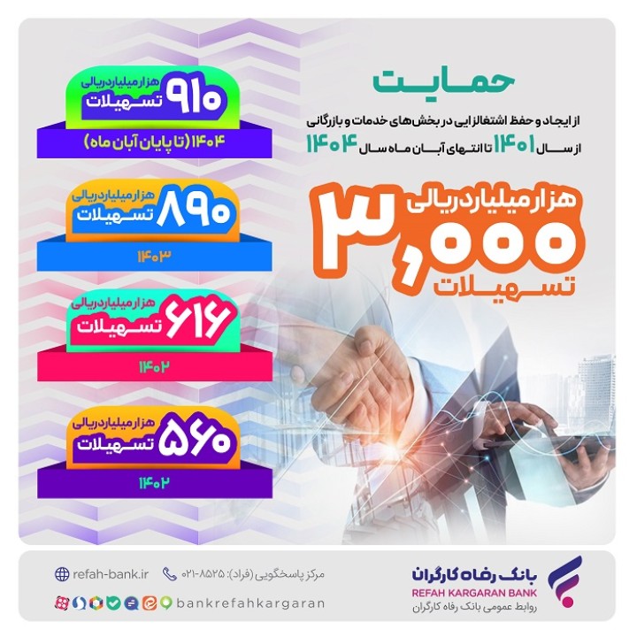 همچنین بانک رفاه کارگران در سال 1402 بالغ بر 616.000 میلیارد ریال تسهیلات در حوزههای خدمات و بازرگانی پرداخت کرده است که در مقایسه با سال پیش از آن، رشد 10 درصدی را نشان میدهد. این بانک در سال 1401 نیز حدود 560.000 میلیارد ریال تسهیلات در این بخشها پرداخت کرده است. لازم به ذکر است، بانک رفاه کارگران در سالهای اخیر از طریق افزایش حمایتهای تسهیلاتی از این حوزهها نقش اثربخشی در پیشبرد برنامههای توسعهای آنها داشته است.