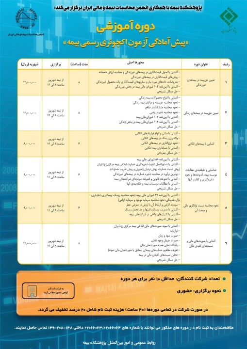 این دورههای آموزشی با ظرفیت حداقل 10 نفر برای هر دوره و مجموعا به مدت 40 ساعت برگزار خواهد شد. عناوین این دورهها شامل «تعیین حقبیمه در بیمههای غیرزندگی»، «تعیین حقبیمه در بیمههای زندگی»، «آشنایی با بیمههای اتکایی»، «شناسایی و طبقهبندی مطالبات موسسه بیمه، اندوختهها و نحوه ذخیرهگیری و کفایت آنها»، «نحوه محاسبه نسبت توانگری مالی و صحت آن» و «آشنایی با صورتهای مالی و نسبتهای کلیدی مالی» است.
