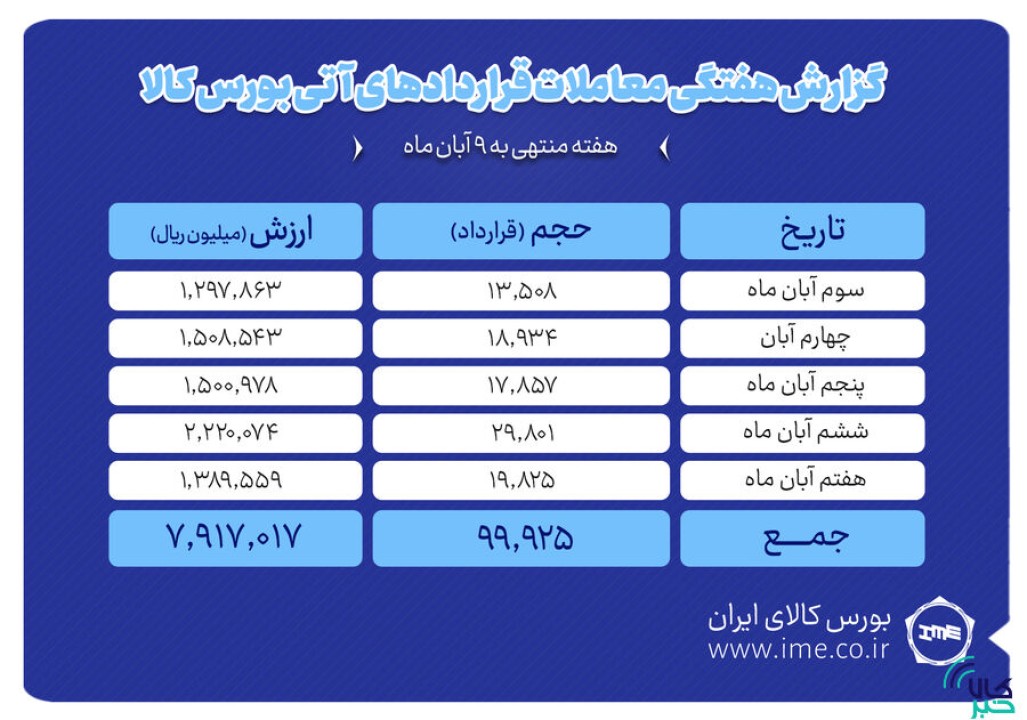بررسی روند معاملات قراردادهای آتی بورس کالای ایران درهفته منتهی به ۹ آبان نشان می دهد که در هفته گذشته ارزش معاملات بازار آتی به حدود ۷۹۲ میلیارد تومان رسید.