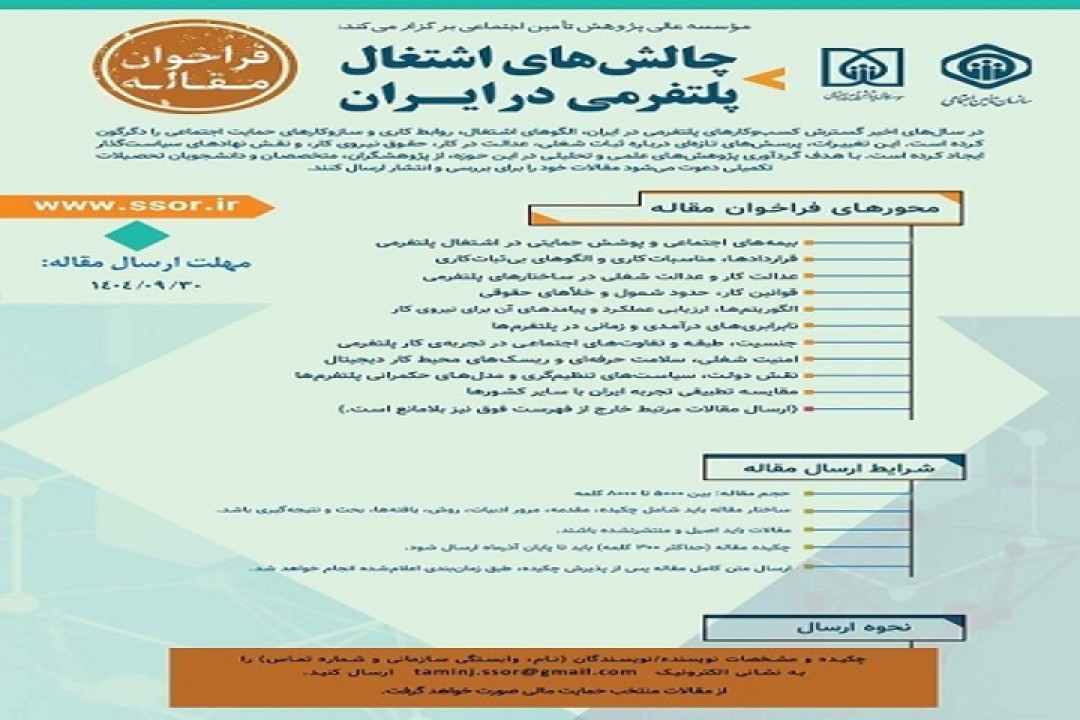 در این فراخوان آمده است: در سالهای اخیر گسترش کسبوکارهای پلتفرمی در ایران، الگوهای اشتغال، روابط کاری و سازوکارهای حمایت اجتماعی را دگرگون کرده است. این تغییرات، پرسشهای تازهای درباره ثبات شغلی، عدالت در کار، حقوق نیروی کار، و نقش نهادهای سیاستگذار ایجاد کرده است.