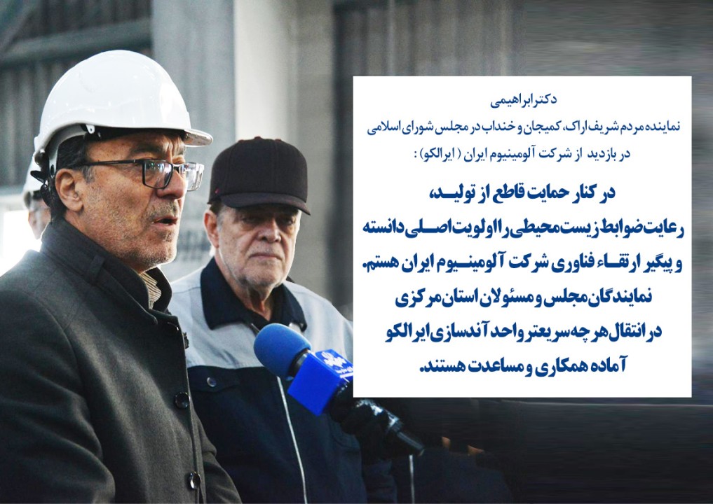دکتر ابراهیمی: در کنار حمایت قاطع از تولید، رعایت ضوابط زیست محیطی را اولویت اصلی دانسته و پیگیر ارتقاء فناوری شرکت آلومینیوم ایران هستم. نمایندگان مجلس و مسئولان استان مرکزی در انتقال هر چه سریعتر واحد آندسازی ایرالکو آماده همکاری و مساعدت هستند.