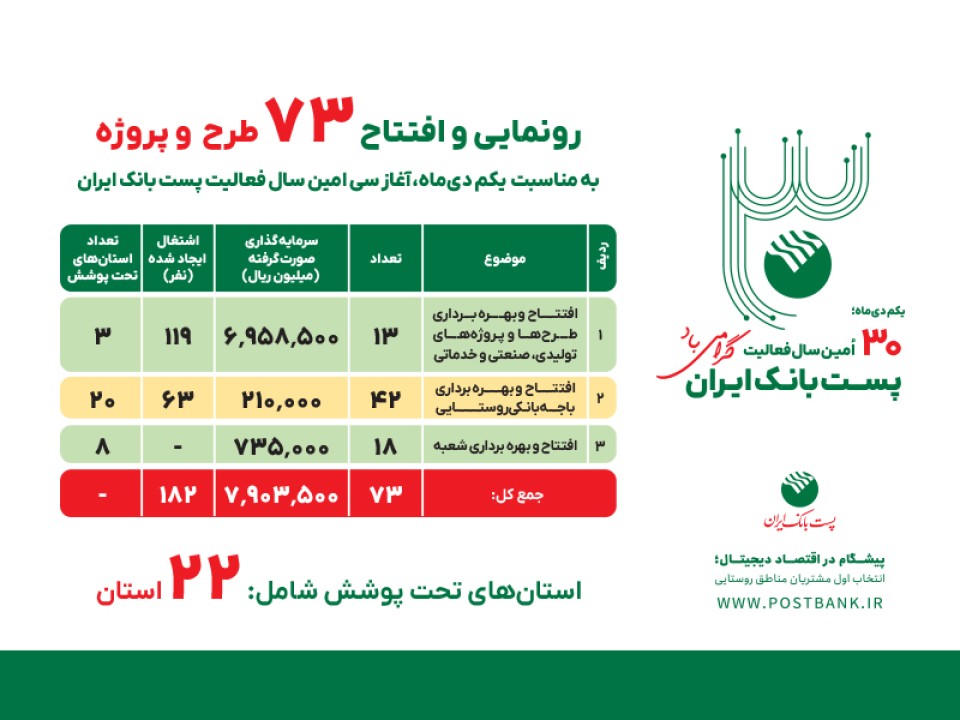 پروژههای افتتاحشده شامل 13 طرح عمرانی، تولیدی، صنعتی و خدماتی، 42 باجه بانکی روستایی و 18 شعبه بانکی است که با مجموع سرمایهگذاری بیش از 7 هزار و 903 میلیارد ریال به مرحله بهرهبرداری رسیدهاند. اجرای این طرحها زمینه ایجاد اشتغال مستقیم برای 182 نفر را فراهم کرده است.