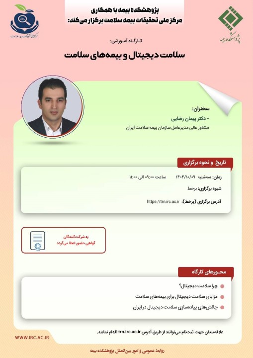 این کارگاه آموزشی با عنوان «سلامت دیجیتال و بیمههای سلامت» روز سهشنبه 9 دیماه 1404 از ساعت 9 تا 11 بهصورت برخط برگزار خواهد شد.